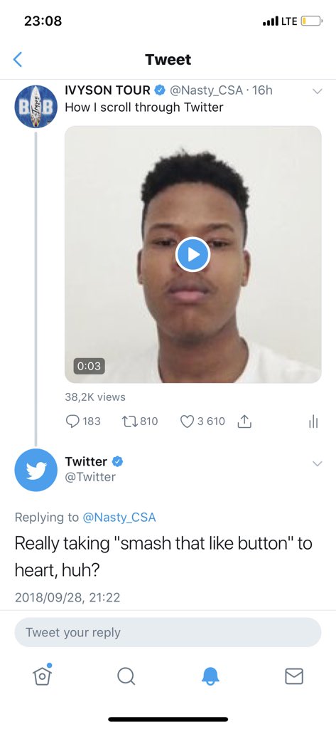 “Really taking ‘smash that like button’ to heart, huh?,” tweeted the official twitter account responding to Nasty’s video. The rapper saw this and shared his excitement with a screenshot of the reply he received from Twitter.