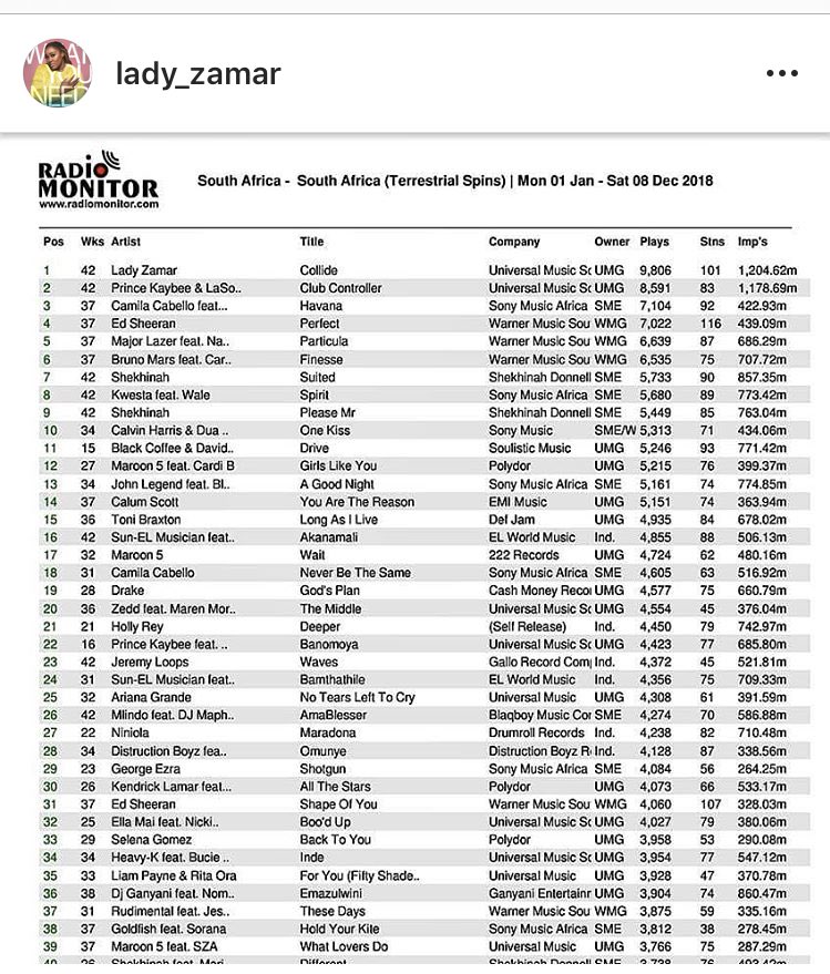 Major Lazers hit single Particular which features Nasty C, Jidenna, Ice Prince and DJ Maphorisa is fifth on the entire list. Kwesta’s Spirit featuring Wale continues to be a force in SA Hip Hop being the eighth most played song on radio. Drake’s God’s Plan and Kendrick Lamar’s All The Stars with SZA are the only other two Hip Hop tracks in this years top 40 most played tracks on radio respectively.
