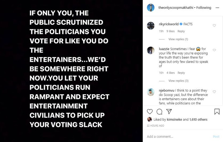 Scoop Makhathini has always made sure to voice his opinions regarding most matters, he chimed into the ongoing events. He took to instagram to share a quote on how the public should be spending more time scrutinizing politicians than celebrities on their participation.